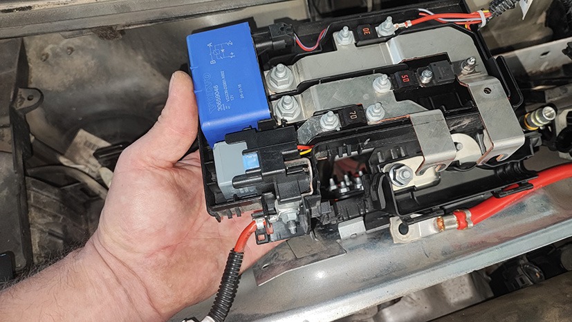 Volvo har placerat en del kraftiga säkringar direkt på batterikablarna. Kunde dessa vara orsaken till problemet? Nej, de visade sig vara hela. Volvo säljer dessa huvudsäkringar som en bit kabel, där man sedan behöver skarva den befintliga batterikabeln med en ny säkring. Verkar det vettigt? Hur många verkstäder har utrustning för att skarva en 30–40 mm2 batterikabel som skall leverera ett par hundra ampere?