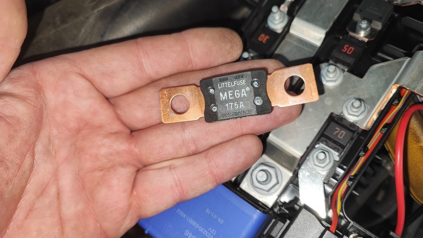 Eftersom klockan var slagen skulle en av verkstadens mekaniker kontrollera säkringarna kommande dag. Beskedet från mekanikern blev dock att alla säkringar var hela, så det fick bli ytterligare en tur till verkstaden. Väl på plats kunde jag konstatera att mekanikern inte hade kontrollerat någon 175 A-säkring. Varför? Det fanns helt enkelt inte någon sådan synlig i boxen.