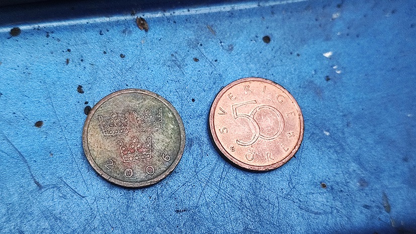 Jag letade upp några gamla kopparmynt som blivit liggandes i skrivbordslådan. Det ena myntet smordes in med ketchup, det andra fick bli referensmynt. Efter cirka två timmar torkade jag bort ketchupen. Och titta, myntet blev som nytt! Detta var helt klart värt att prova även i bilen.