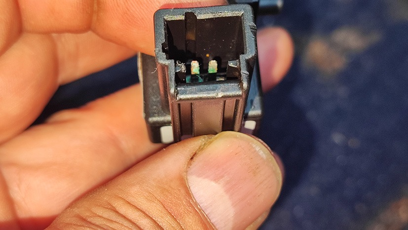 Här hade fukten under golvmattorna uppenbarligen gjort sitt för att ställa till det för de elektriska signalerna. En ny eller begagnad sensor skulle nog gå att få fram, men kontaktstycken till våra bilar kan numera vara nästintill omöjliga att hitta. Inte minst nu sedan Naturvårdsverket förbjudit alla självplockskrotar.