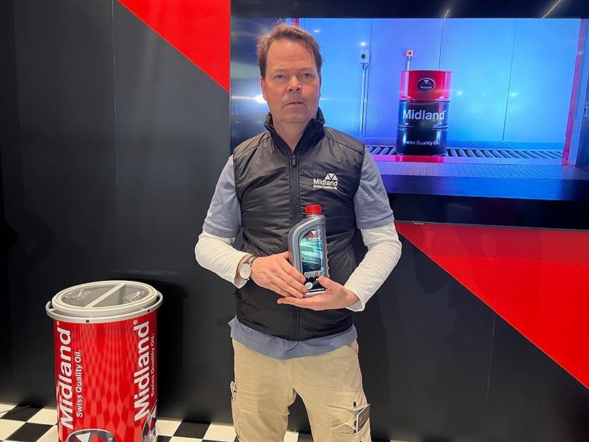 Premiumolja deluxe. Midlands monter tilldrog sig en hel del besökare, och förstås var många av dem nyfikna på olika motoroljor. Här är Jonas på Midland med helsyntetiska motoroljan Synqron 0W-20 för bensinmotorer. En olja som dels ger förbättrad bränsleekonomi, dels har mycket goda startegenskaper.