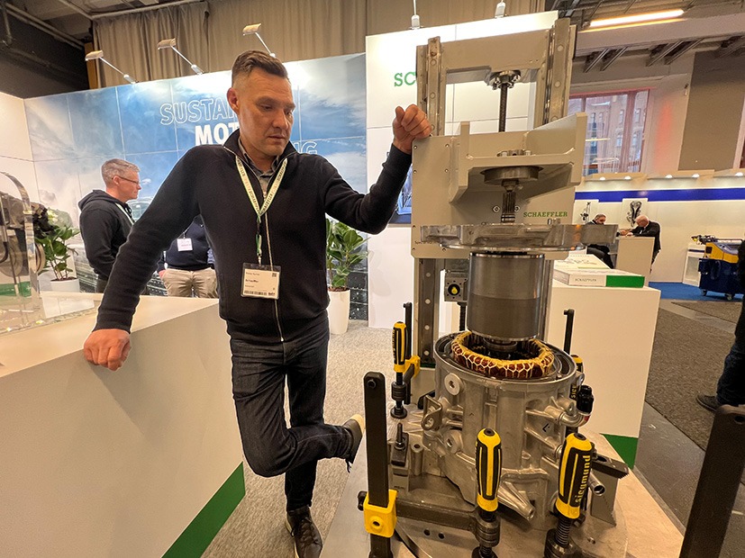 Schaefflers nya verktyg för att jobba med elmotorer. Med detta verktyg går rotorn rakt och fint ur elmotorn utan risk att slå i statorn, som kan skada isoleringen eller än värre. På bilden: Reinis från Schaeffler.